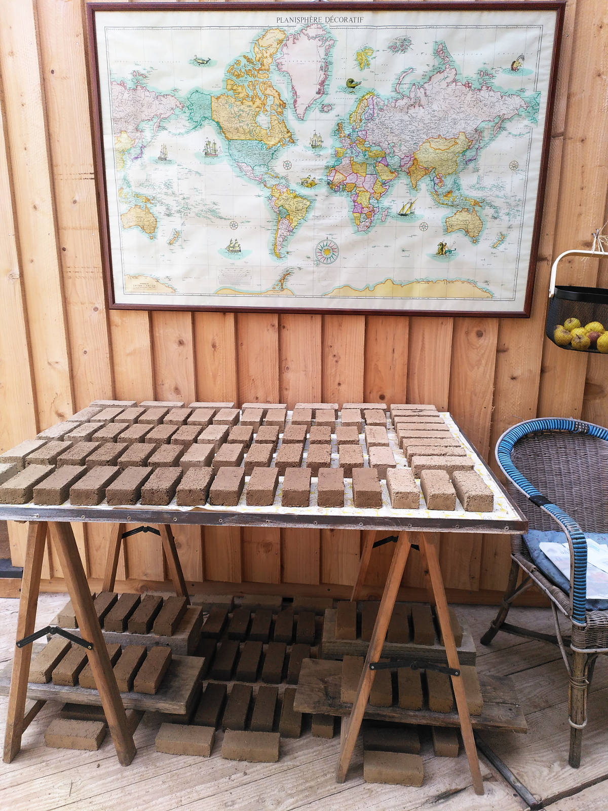Réalisation de plus de 300 briques moulées à la main et mise en place selon un calepinage contemporain et joints creux.
