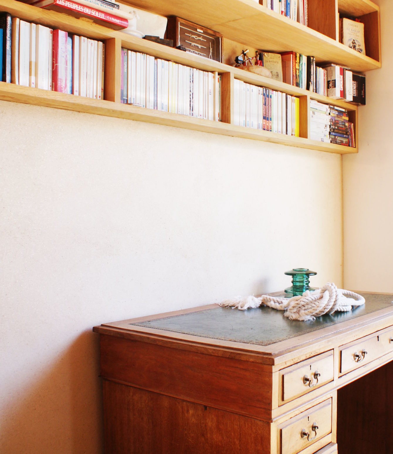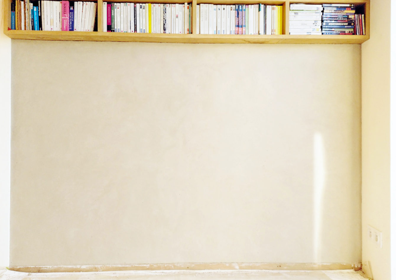 Dans cette maison bioclimatique sur pilotis, la terre excavée lors des fondations a été judicieusement mise à l’abri pour la réalisation d’enduits de 5-6 cm d’épaisseur pour apporter de la masse et réguler la température. Réalisation de 5 murs avec des techniques d’accroches, et des finitions différentes, à Crac’h. Enduit de finition à l’argile blanche et sable.