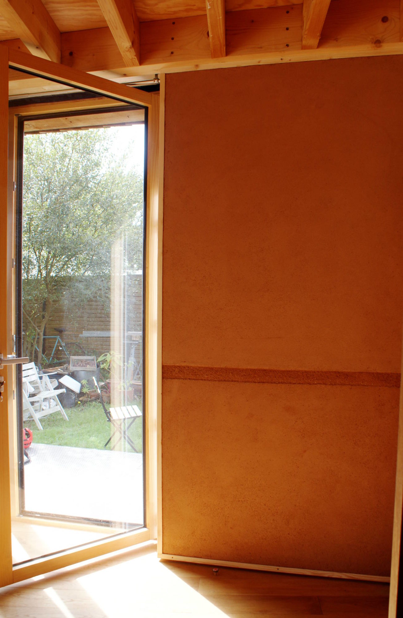 Dans cette maison bioclimatique sur pilotis, la terre excavée lors des fondations a été judicieusement mise à l’abri pour la réalisation d’enduits de 5-6 cm d’épaisseur pour apporter de la masse et réguler la température. Réalisation de 5 murs avec des techniques d’accroches, et des finitions différentes à Crac’h. La terre du terrain a ici été relevée avec des pigments pour la finition.