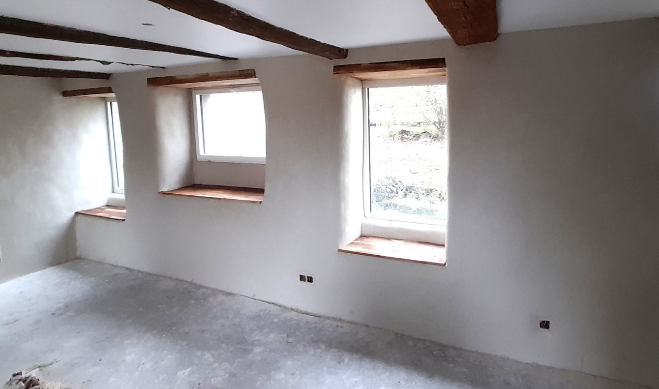 Finition chaux-chanvre La finition, lissée, a été appliquée sur un chaux-chanvre projeté, à Plumergat. Les images ont été prises en cours de séchage. finition lissée