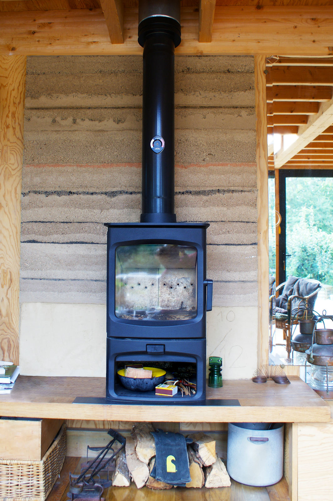 Parement en pisé de 6 cm derrière un poêle pour lui donner de l’inertie.