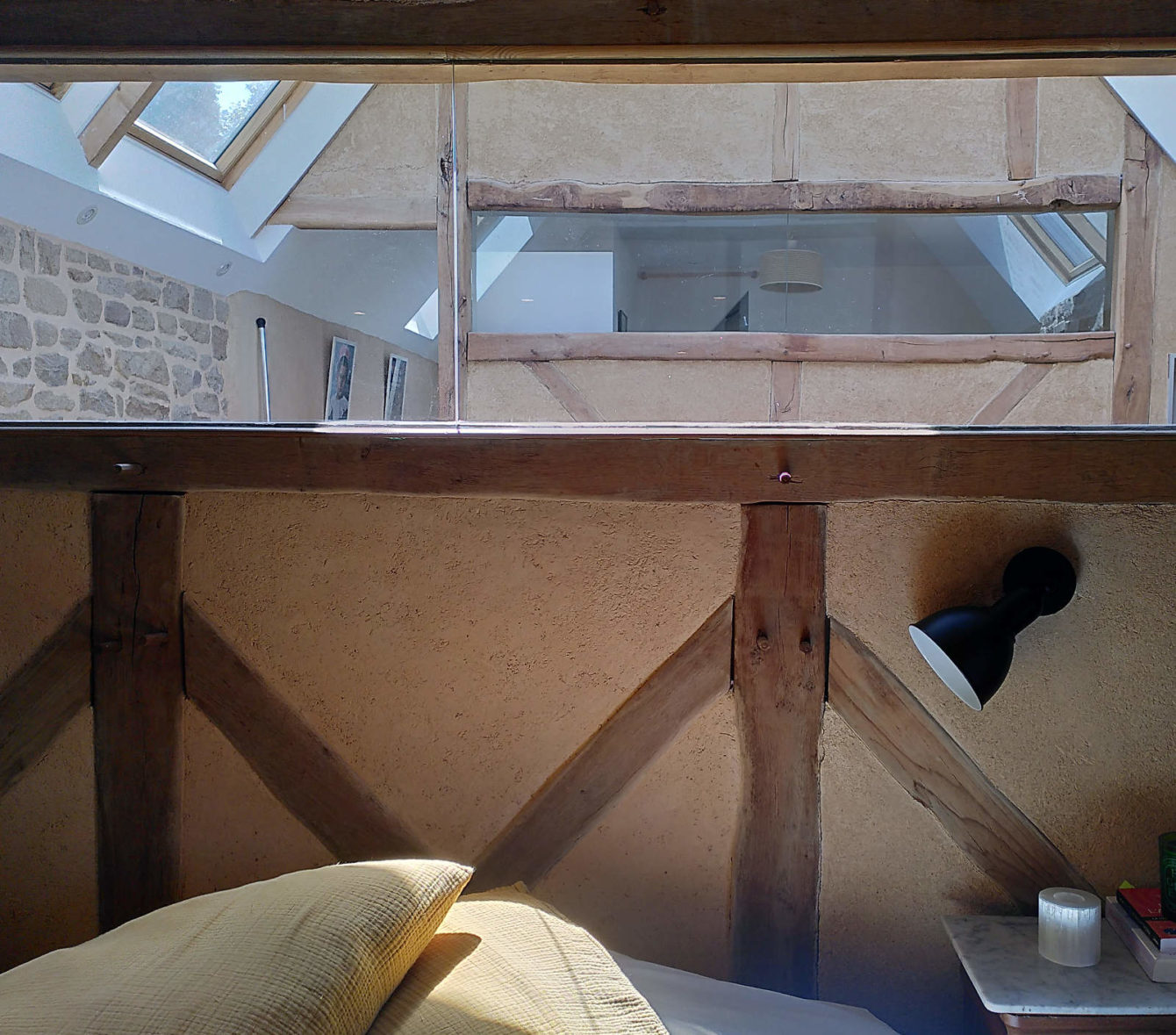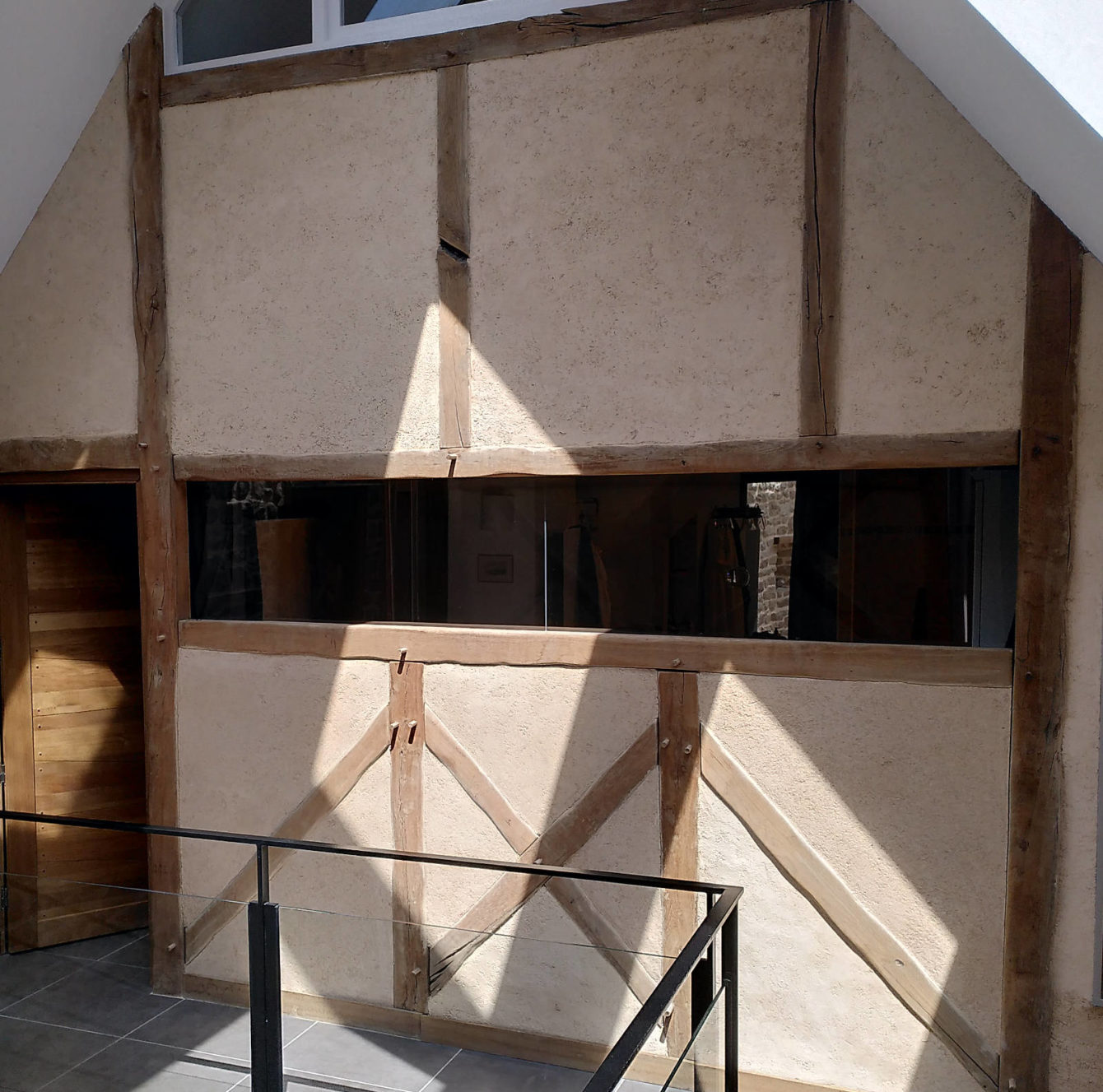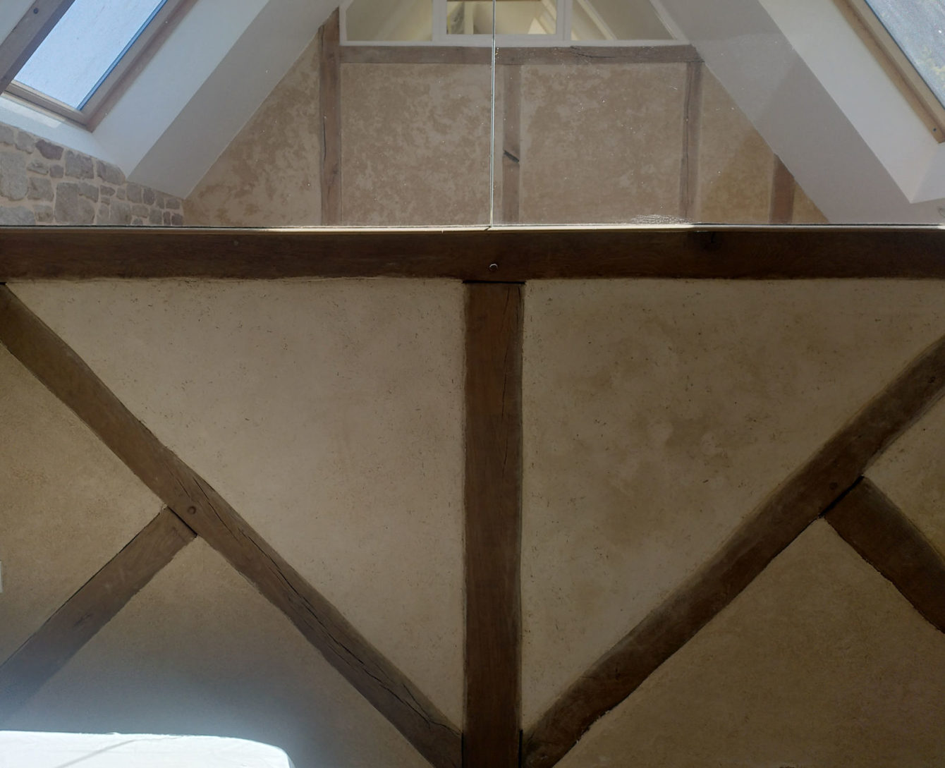 Rénovation d’une partie des cloisons en pans de bois, dans une longère à Plouharnel. Le chaux-chanvre initial, datant d’une dizaine d’années a probablement souffert d’une carbonatation trop rapide ce qui l’a rendu friable.